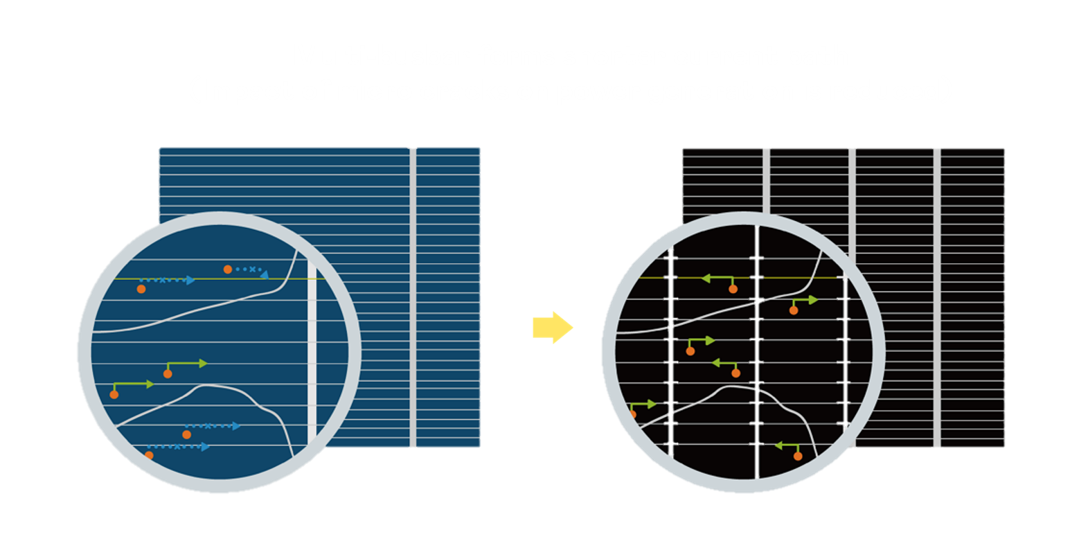- 電池使用多條銅導線 (Copper wire) 於電池片上形成較短的電流路徑,提高電流收集效率,採用圓形設計的銅導線較傳統扁平式的銅焊帶 (Ribbon),可增加入射至電池的光線量。